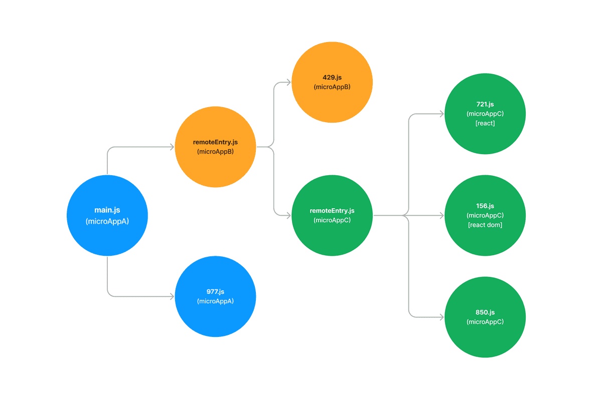 - main.js: 최초에 앱을 초기화하는 역할을 합니다. 가장 상위의 Micro App A의 HTML에서 가장 먼저 불러와지는 청크가기도 합니다. Micro App A의 Container Reference를 가진 청크로, 해당 처리를 해줍니다. 이 외에도 createRoot등, 브라우저에서도 앱을 최초로 초기화하는데 필요한 코드들을 가지고 있습니다.
